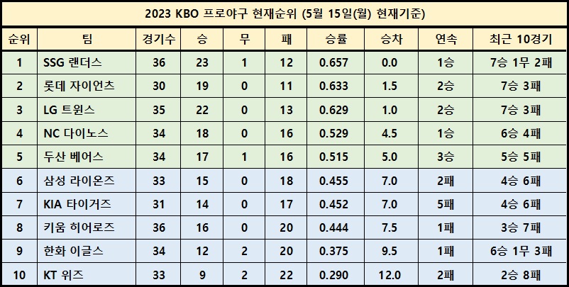 경기가 없는 5월 15일 월요일 기준의 현재 순위도 알아보겠습니다.