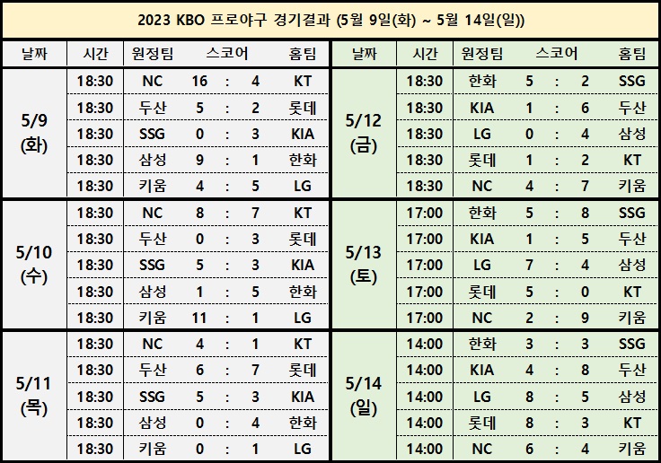 | 2023 KBO 프로야구 주간 경기결과 현재순위 경기일정 (2023년 05월 8일 기준) (5) | 2023.05.08 |