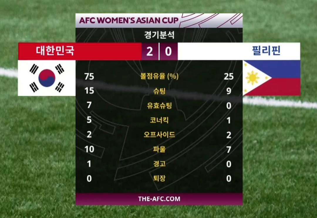 아래 경기 분석에서도 볼 수 있듯이, 볼 점유율에서부터 대한민국의 일방적인 흐름으로 진행된 2022 AFC 여자 아시안컵 대한민국 대 필리핀의 4강전..